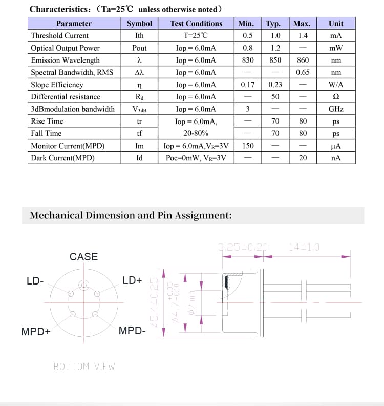 Subject : 1.25G 850nm VCSEL LD TO-CAN Series laser diode