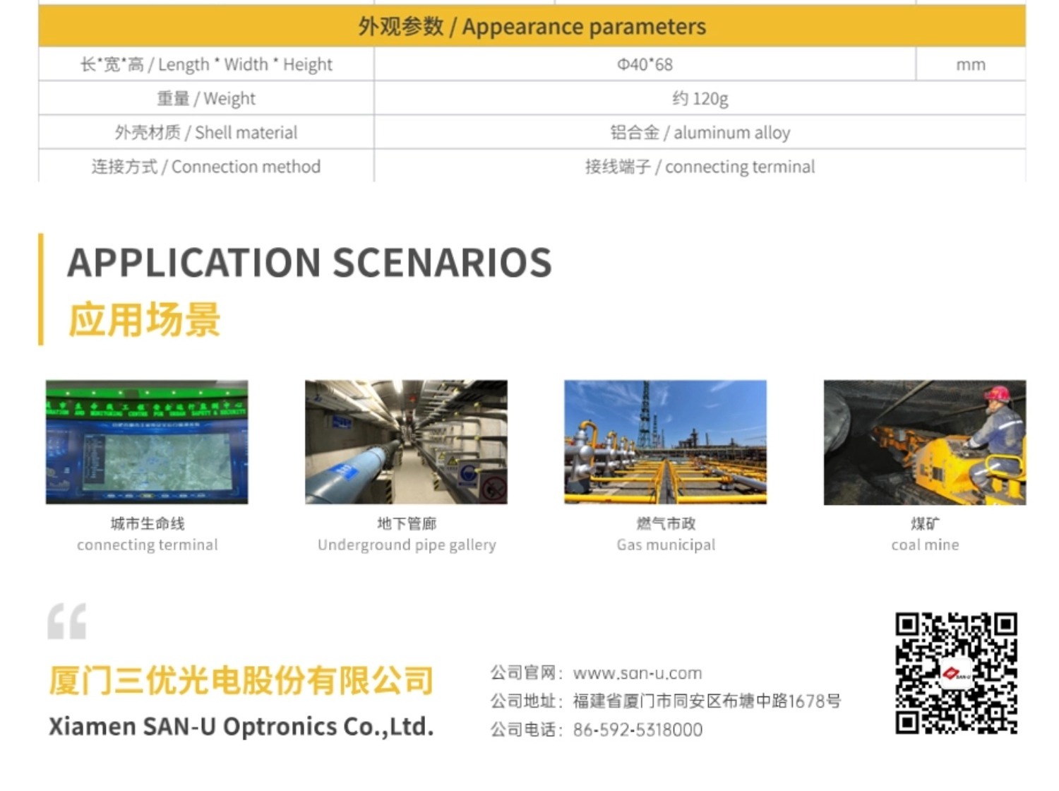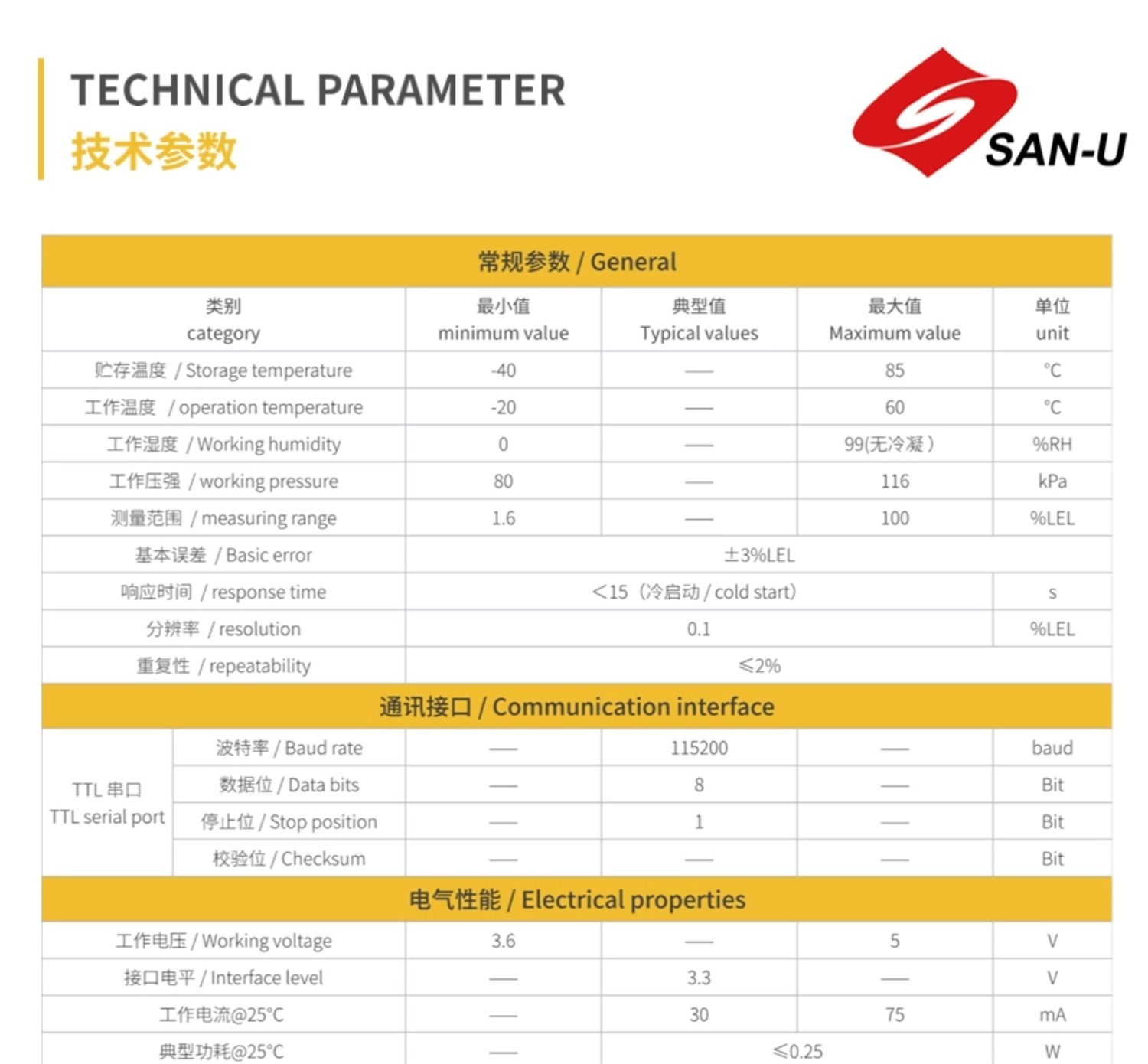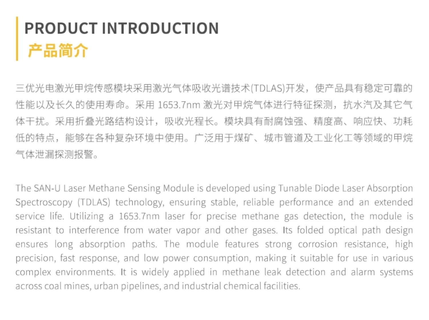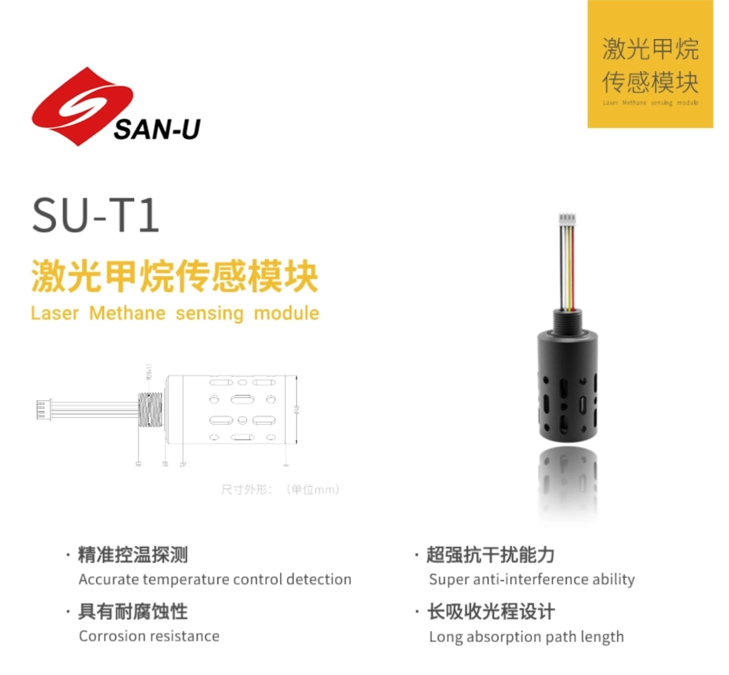 The SAN-U Laser Methane Sensing Module is developed using Tunable Diode Laser Absorption Spectroscopy(TDLAS)technology,ensuring stable,reliable performance and an extended service life.Utilizing a 1653.7nm laser for precise methane gas detection,the module is resistant to interference from water vapor and other gases.Its folded optical path design ensures long absorption   paths.The module features strong corrosion resistance,high precision,fast response,and low power consumption,making it suitable for use in various complex environments.It is widely  applied  in methane leak detection and alarm systems across coal mines,urban pipelines,and industrial chemical facilities.